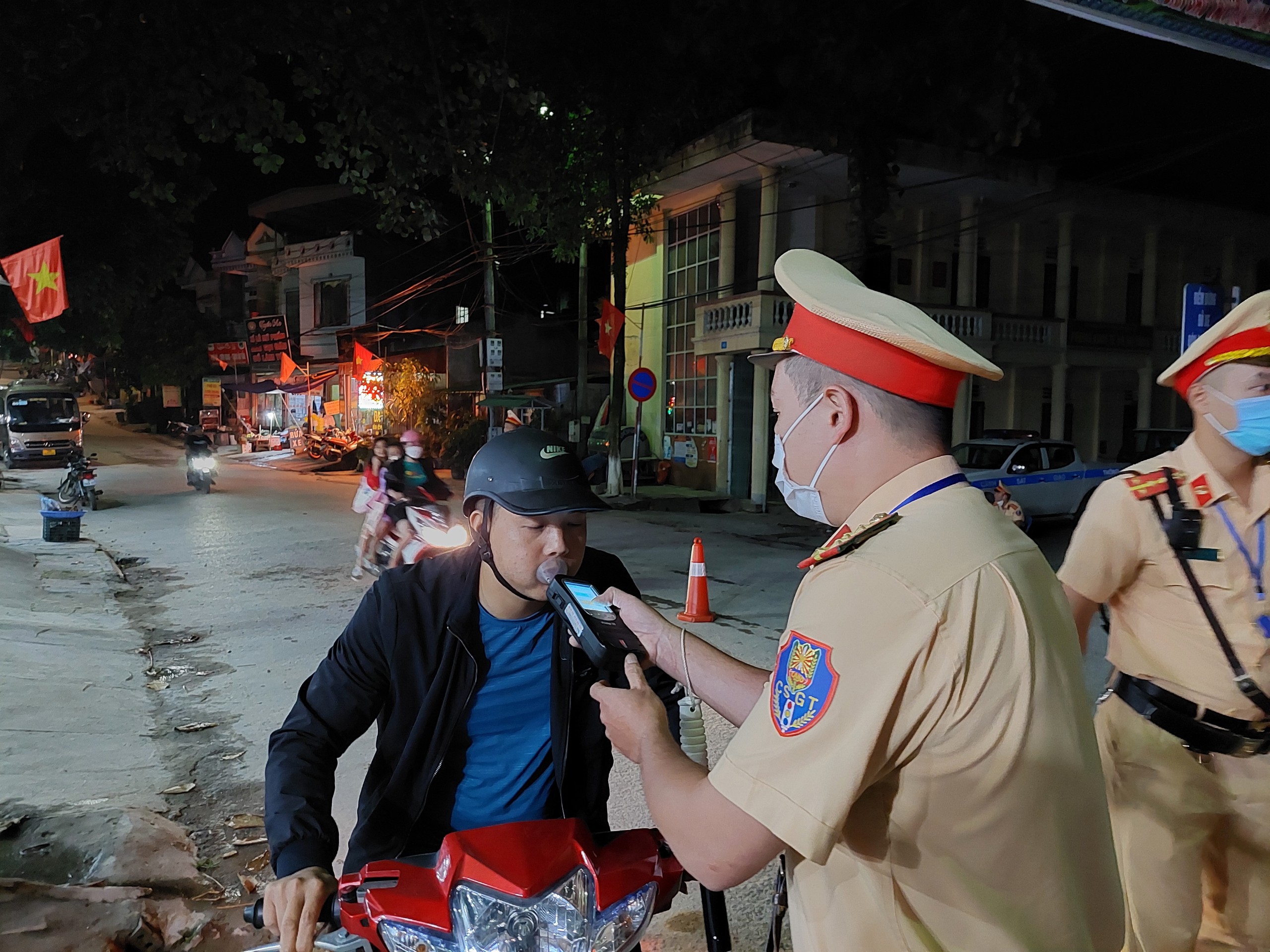 Cán bộ Đội CSGT - TT Công an huyện Hoàng Su Phì (Hà Giang) kiểm tra đo nồng độ cồn tài xế xe máy, ôtô tại Km 1 + 200 đường tỉnh 177 thuộc Tổ 3 thị trấn Vinh Quang (Huyện Hoàng Su Phì, tỉnh Hà Giang).