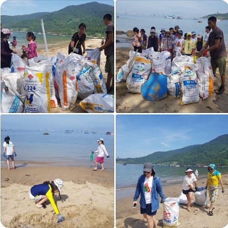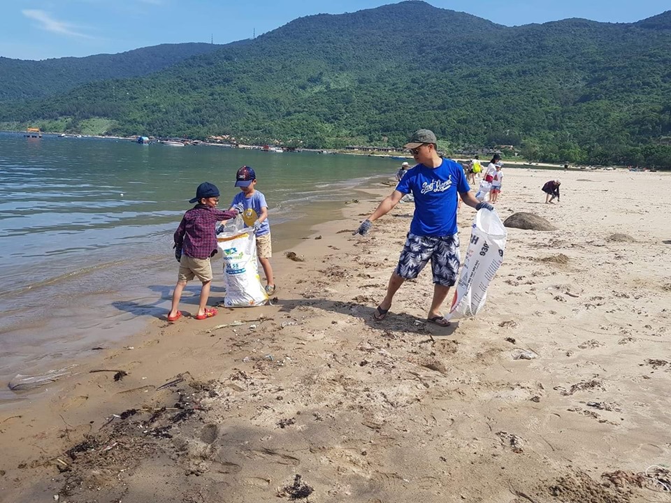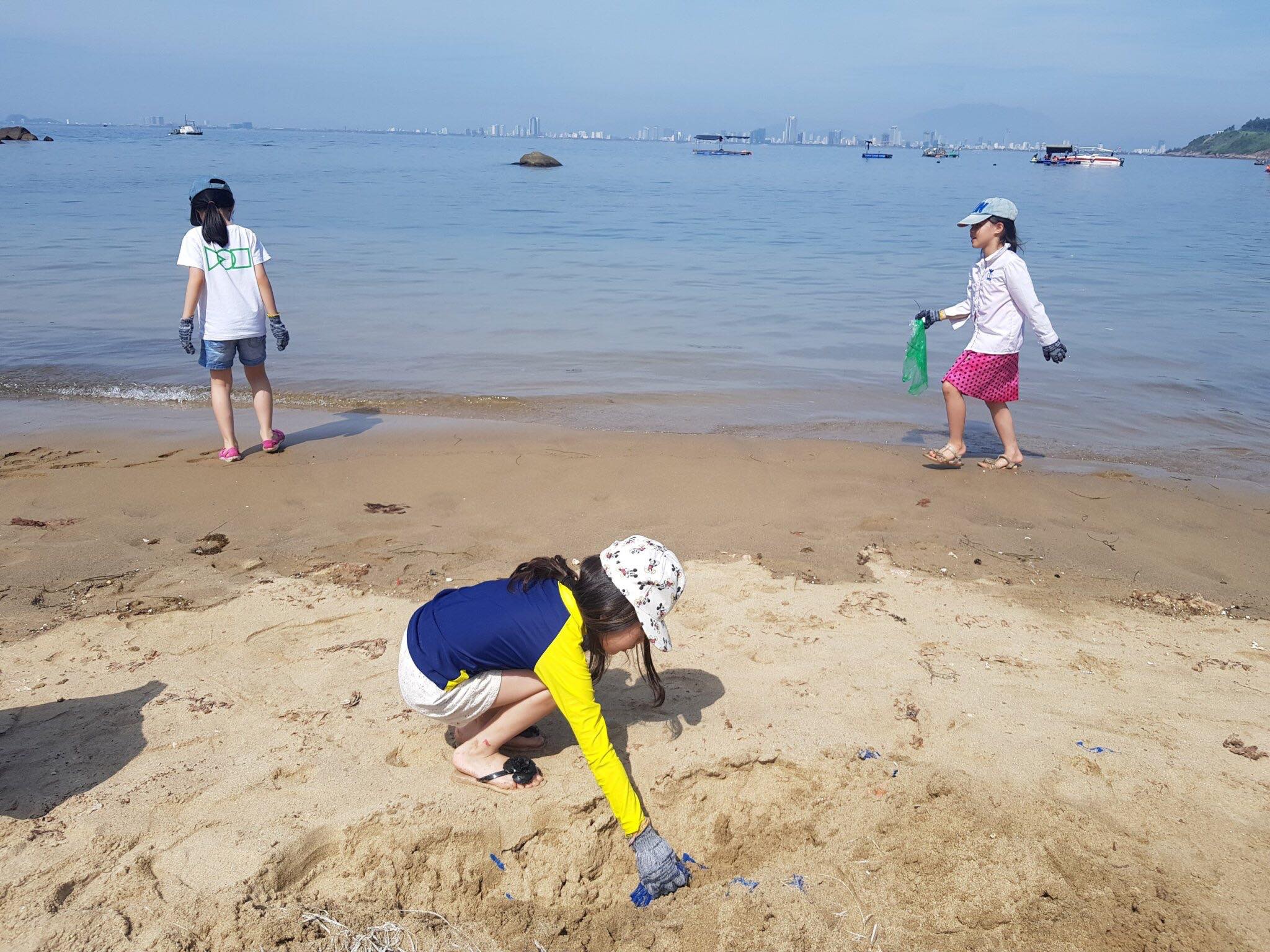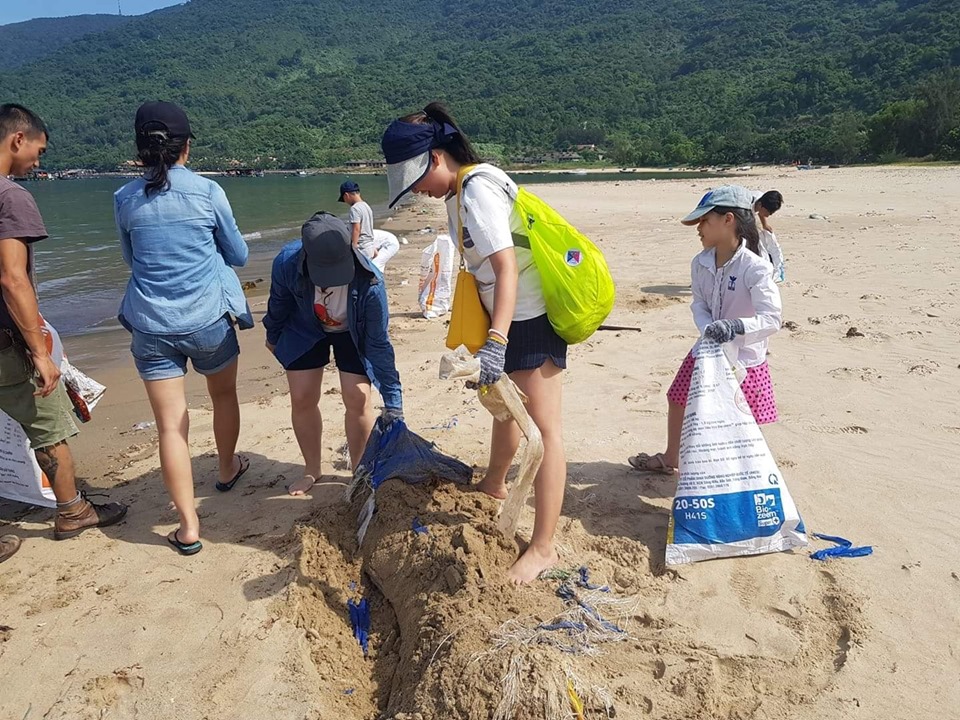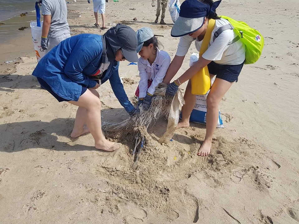 | Phụ huynh và học sinh trường CGD cùng nhau nhặt rác tại bãi biển Sơn Trà |