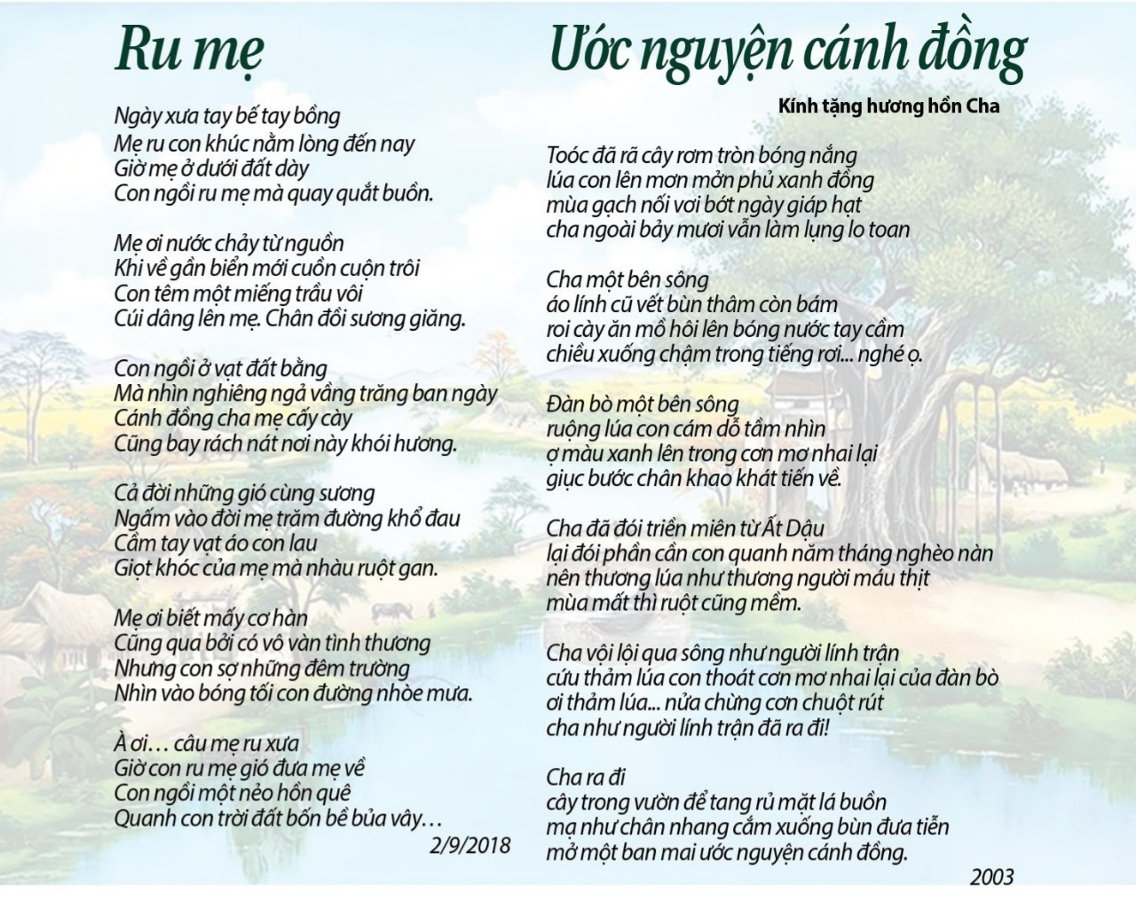Dưới đây là 2 bài thơ, trong số 80 bài trong tập “BAY TRONG MƠ” ở ấn phẩm “mới toanh” của Trần Quang Đạo - hai khúc nhớ thương, buồn đau hiu hắt dành vọng bái tới cha mẹ nơi cõi cửu tuyền... Điều khá đặc biệt ở hai bài thơ này là dấu tích "sở trường" của phong cách (phương pháp sáng tác) lối "thơ văn xuôi" truyền thống "Trần Quang Đạo" vẫn được duy trì "liền mạch", hằn sâu trong từng con chữ, hơi thơ cùng nhịp điệu của nó. Lạ là ngay bài thơ thứ nhất "RU MẸ" theo thể "lục bát" 100%, vẫn đong đầy cảm xúc của... "thơ văn xuôi".