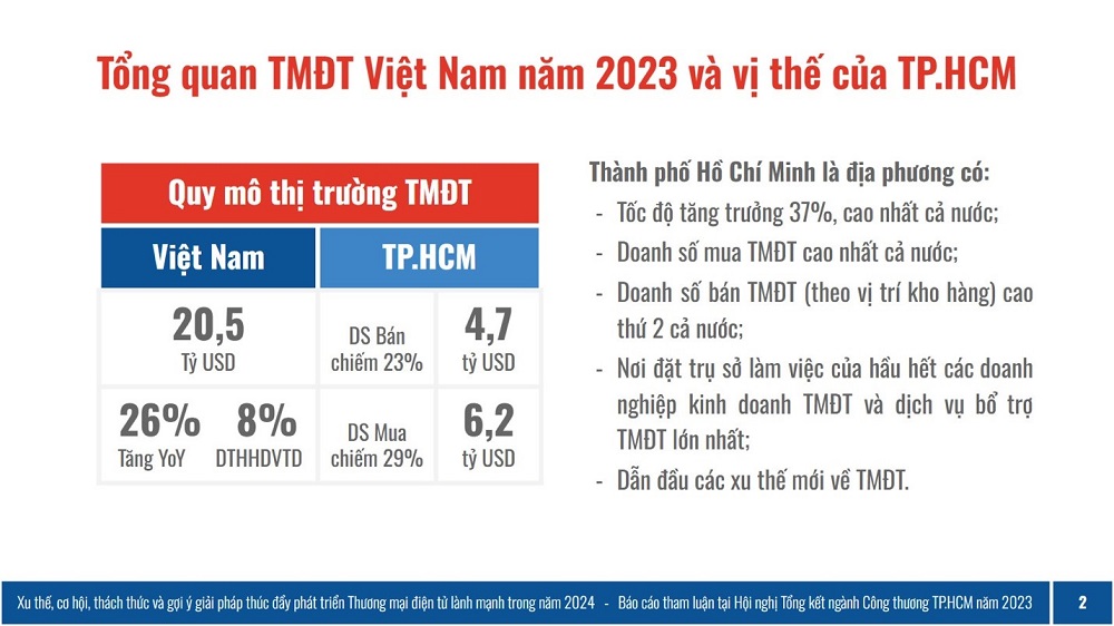 Tại phiên họp, Phó Trưởng Phòng Quản lý thương mại (Sở Công thương TP.HCM) Nguyễn Minh Hùng đã có thông tin về doanh thu thương mại điện tử, bán hàng trực tuyến - livestream của TP Hồ Chí Minh trong đợt mua sắm cuối năm qua. Theo đó, năm 2023, thị trường thương mại điện tử Việt Nam ước đạt 20,5 tỷ USD, tăng khoảng 4 tỷ USD (tương đương 25%) so với năm 2022. Riêng TPHCM đạt 4,7 tỷ USD (khoảng 112.000 tỷ đồng), tốc độ tăng trưởng đạt 37%, cao nhất cả nước.