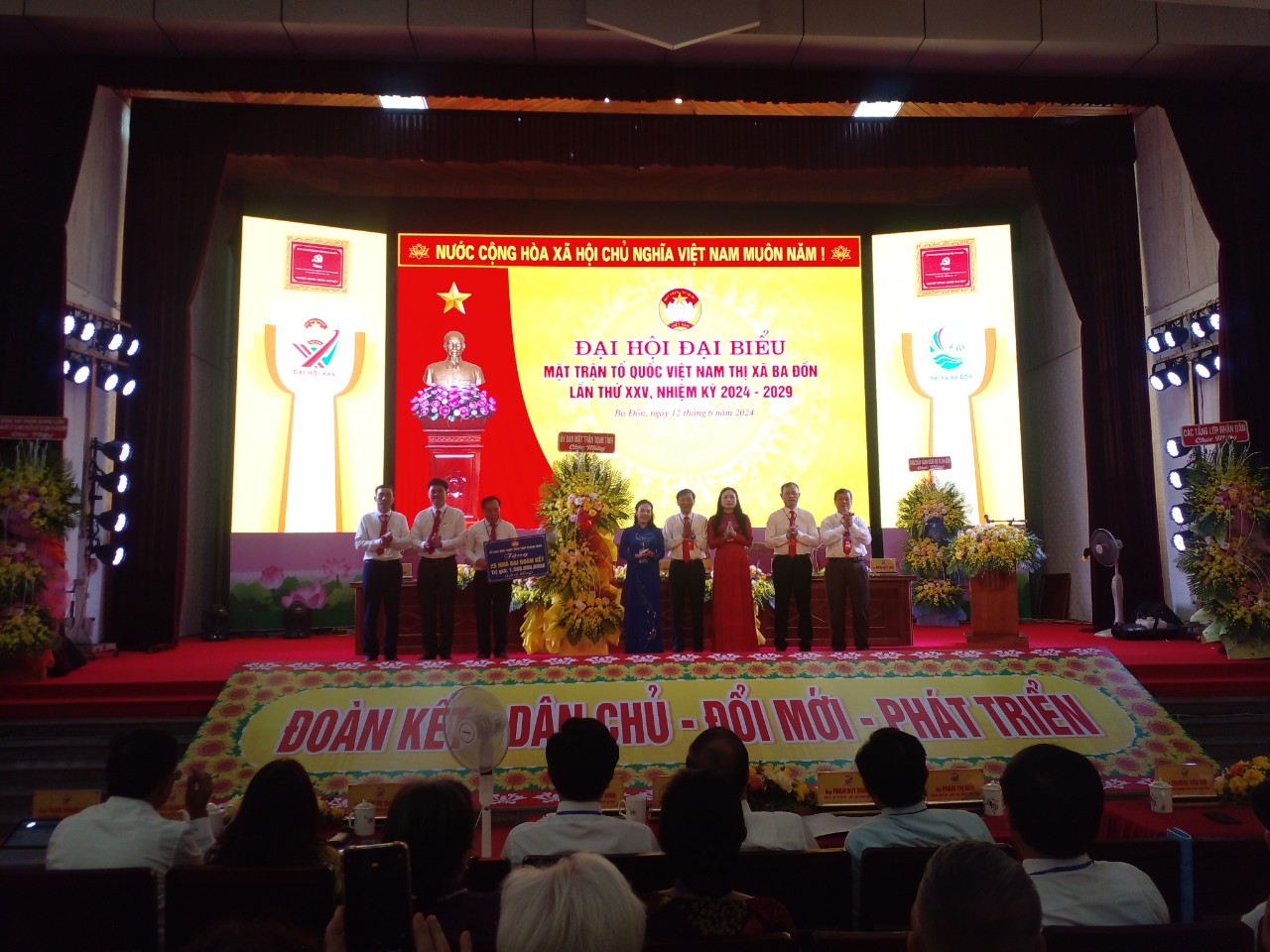 Dịp này, Ủy ban MTTQ Việt Nam tỉnh trao tặng lãng hoa chúc mừng cho Ủy ban MTTQ Việt Nam thị xã và trao tặng 1,5 tỷ đồng để hỗ trợ xây dựng 25 nhà Đại đoàn kết cho hộ nghèo thị xã; Ban chấp hành Đảng Bộ thị xã Ba Đồn kính tặng Đại hội đại biểu Mặt trận Tổ quốc Việt Nam thị xã Ba Đồn, lần thứ XXV, nhiệm kỳ 2024-2029 với bức thiết bảng “Đoàn kết- Dân chủ- Đổi mới- Phát triển”.