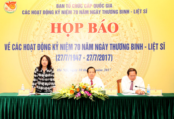Phát biểu tại buổi họp báo, Bộ trưởng Bộ LĐ-TB&XH Đào Ngọc Dung cho biết, tháng 7 là một tháng có ý nghĩa linh thiêng với tổ quốc, với đất nước. Những ngày tháng 7 trong cả nước sẽ diễn ra nhiều hoạt động thiết thực, ý nghĩa để tri ân người có công. Hưởng ứng lời kêu gọi của Chủ tịch Ủy ban Trung ương mặt trận Tổ quốc Việt nam, mỗi cơ quan, tổ chức, mỗi gia đình không thuộc diện nghèo hãy có một việc làm cụ thể để góp phần chăm lo cho các gia đình liệt sĩ, thương binh, gia đình chính sách. Hỗ trợ tất cả thương binh, những người có nhu cầu cần xe lăn. Tạo điều kiện để con em các gia đình liệt sĩ, thương binh thật sự khó khăn việc làm được hỗ trợ tìm việc làm.