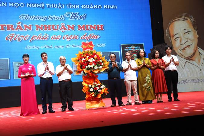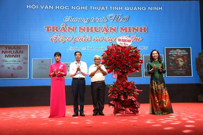 UBND tỉnh Quảng Ninh và Hội Nhà văn Việt Nam tặng hoa chúc mừng Nhà thơ Trần Nhuận Minh.