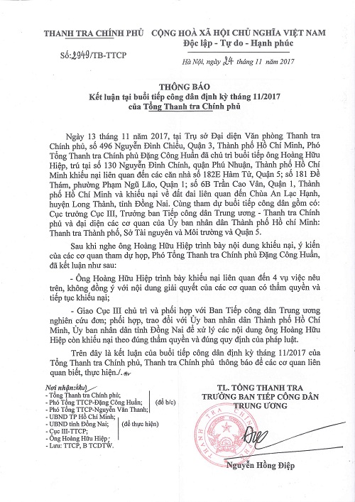 Thông báo có nội dung như sau: “Ngày 13 tháng 11 năm 2017, tại Trụ sở Đại diện Văn phòng Thanh tra Chính phủ, số 496 Nguyễn Đình Chiểu, Quận 3, Thành phố Hồ Chí Minh, Phó Tổng Thanh tra Chính phủ Đặng Công Huẩn đã chủ trì buổi tiếp ông Hoàng Hữu Hiệp, trú tại 130 Nguyễn Đình Chính, quận Phú Nhuận, thành phố Hồ Chí Minh khiếu nại liên quan đến các căn nhà số 182E Hàm Tử, Quận 5; số 181 Đề Thám, phường Phạm Ngũ Lão, Quận 1; số 6B Trần Cao Vân, Quận 1, Thành phố Hồ Chí Minh và khiếu nại về đất đai liên quan đến Chùa An Lạc Hạnh, huyện Long Thành, tỉnh Đồng Nai. Cùng tham dự buổi tiếp công dân gồm: Cục trưởng Cục III, Trưởng Ban Tiếp công dân Trung ương - Thanh tra Chính phủ và đại diện các cơ quan Ủy ban nhân dân Thành phố Hồ Chí Minh: Thanh tra Thành phố, Sở Tài nguyên và Môi trường và Quận 5.