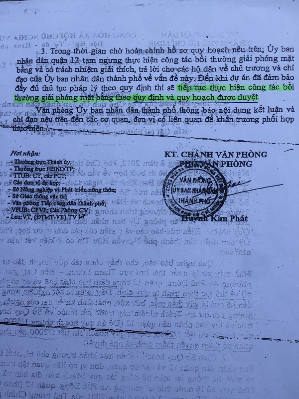 Ngày hôm sau, 25/5/2018, UBND thành phố có Quyết định số 2206/QĐ-UBND do Phó Chủ tịch Huỳnh Cách Mạng ký, thụ lý đơn tố cáo đối với Chủ tịch UBND quận 12 Lê Trương Hải Hiếu và Phó Chủ tịch UBND quận 12 Trịnh Thị Mỹ Lan. Phải 7 tháng sau, ngày 11/12/2018, UBND thành phố có Thông báo số 361/TB-UBND, về kết quả giải quyết tố cáo. Mặc dù nội dung Thông báo chưa làm rõ các nội dung tố cáo của công dân và quá trình thụ lý đơn tố cáo không theo trình tự, thủ tục của Luật Tố cáo nên công dân không đồng ý với kết quả giải quyết tố cáo của UBND thành phố, đã có đơn tố cáo tiếp gửi cấp có thẩm quyền. Tuy nhiên, lợi dụng Thông báo kết quả giải quyết tố cáo của UBND TP.Hồ Chí Minh, ngày 27/12/2018, Chủ tịch UBND quận 12 Lê Trương Hải Hiếu, chỉ đạo UBND phường Thới An, lực lượng công an, dân phòng, dân quân tự vệ....lên tới hàng trăm người, đến cắm mốc dự án mà không họp dân, không thông báo cho người dân tổ 2 khu phố 6 được biết. Đoàn công tác do Chủ tịch UBND phường Thới An Hồ Minh Hoàng dẫn đầu, không có Quyết định hoặc Kế hoạch công tác để thực thi nhiệm vụ, nói cách khác là không có tờ giấy lận lưng. Tại đây, Chủ tịch phường Thới An chỉ đạo lực lượng Công an còng tay anh Nguyễn Chí Quảng, mặc dù anh Quảng chỉ cầm xô nhựa đựng sơn, bị một số phụ nữ lạ mặt xô đẩy, để kiếm cớ là có hành vi cản trở người thi hành công vụ. Cùng lúc đó, Công an còn mời một số công dân về Công an phường để làm bản tường trình về việc cản trở người thi hành công vụ. Hiện các công dân đang KN Quyết định 2197/QĐ-UBND của UBND thành phố do Phó Chủ tịch Trần Vĩnh Tuyến ký.