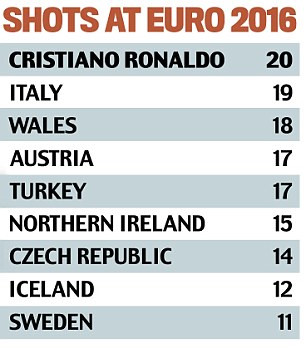 Thậm chí, số pha bắn phá khung thành của Ronaldo còn hơn 8 đội bóng tham dự EURO 2016. Theo đó, Ronaldo xếp trên Italia (19 cú sút), Xứ Wales (18), Áo (17), Thổ Nhĩ Kỳ (17), Bắc Ireland (15), CH Séc (14), Iceland (12) và Thụy Điển (11).