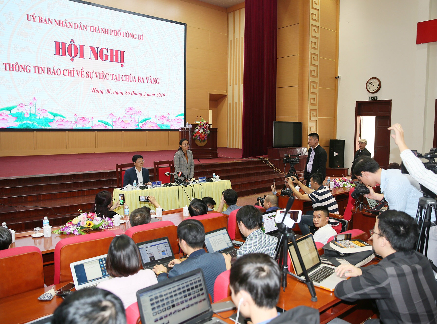 Tại buổi thông tin báo chí, Chủ tịch UBND thành phố Uông bí Nguyễn Mạnh Hà cho biết: Ngày 20/3/2019, ngay sau khi Báo Lao Động có bài viết, phóng sự truyền hình “Truyền bá chuyện vong báo oán, chùa Ba Vàng mỗi năm thu trăm tỷ”, phản ánh tại chùa Ba Vàng (TP Uông Bí) có hoạt động gọi vong. Theo nội dung phản ánh, ai muốn thoát nạn phải “trả nợ” cho vong từ vài triệu đến hàng chục triệu đồng thông qua hình thức công đức vào nhà chùa. UBND tỉnh Quảng Ninh đã ban hành công văn số 1710/UBND-VX1 gửi UBND TP Uông Bí, yêu cầu thành phố chủ trì, phối hợp với Sở Nội vụ, Sở Văn hoá - Thể thao, Công an tỉnh và các đơn vị liên quan kiểm tra, xác minh làm rõ những nội dung thông tin bài báo phản ánh, có biện pháp kịp thời ngăn chặn, xử lý nghiêm những hành vi vi phạm (nếu có) đồng thời thông tin cho các cơ quan báo chí biết kết quả giải quyết.