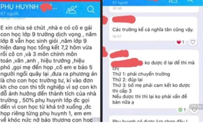 Tương tự, có phụ hunh cungx phản ảnh trường THCS Dịch Vọng Hậu (Cầu Giấy) vận động học sinh có học lực yếu kém chuyển trường hoặc phụ huynh ký cam kết không thi vào lớp 10. Tuy nhiên, bà Lê Thị Thúy Nga, Hiệu trưởng trường THCS Dịch Vọng khẳng định thông tin này không có thực.