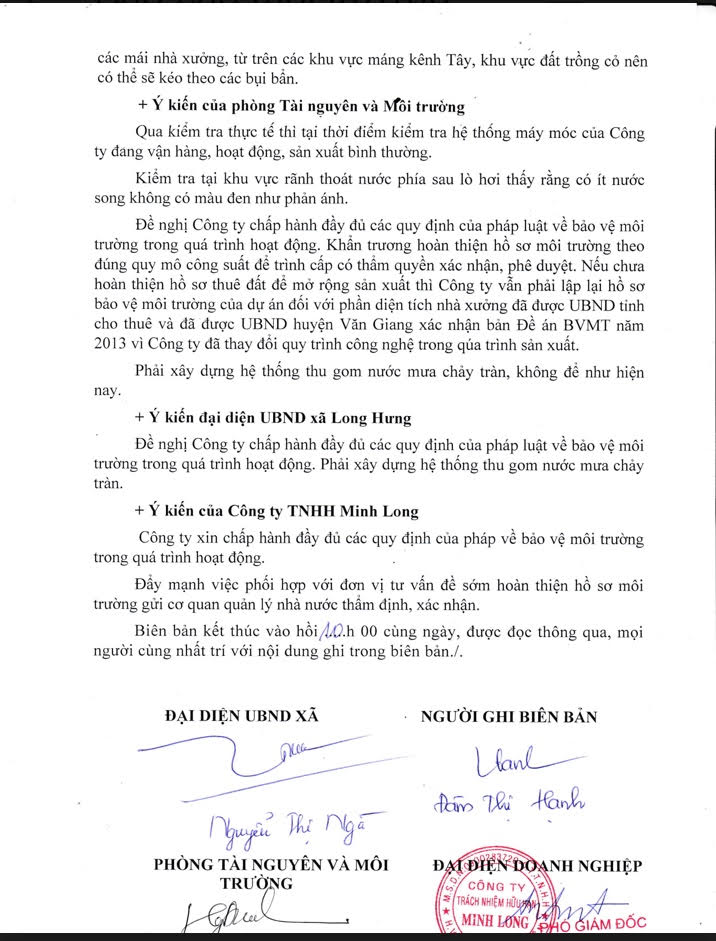 Tiếp nhận thông tin nêu trên, UBND huyện Văn Giang đã chỉ đạo phòng Tài nguyên & Môi trường thành lập Tổ công tác liên ngành kiểm tra đột xuất hoạt động sản xuất kinh doanh cũng như công tác xử lý khí thải, nước thải đảm bảo vệ sinh môi trường của Công ty TNHH Minh Long.
