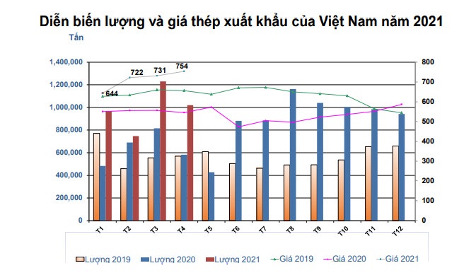 Giá xuất khẩu thép trong tháng 4 đạt 754 USD/tấn, tăng 3% so với tháng 3, tăng 17% so với tháng 1.