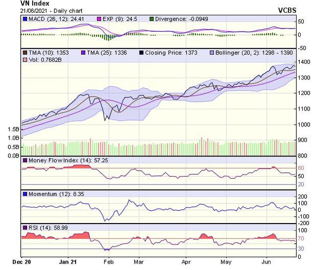 Tuy nhiên, một khi thị trường chưa đánh mất ngưỡng hỗ trợ ngắn hạn quanh 1.345 điểm (MA20) thì xu hướng hiện tại vẫn được đánh giá ở mức trung tính. Do đó, trong phiên giao dịch tiếp theo, thị trường có thể sẽ tiếp tục giao dịch giằng co tại vùng giá hiện tại.