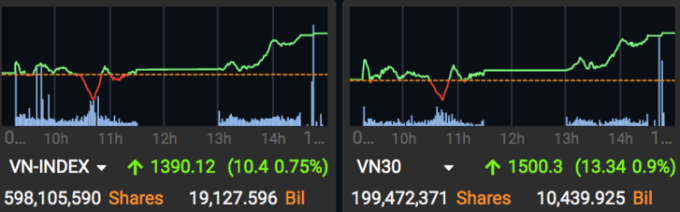 VN-Index hôm qua thăng hoa những phút cuối phiên khi tăng hơn 10 điểm so với tham chiếu, vượt mốc 1.390 điểm và xác lập đỉnh mới trong lịch sử.