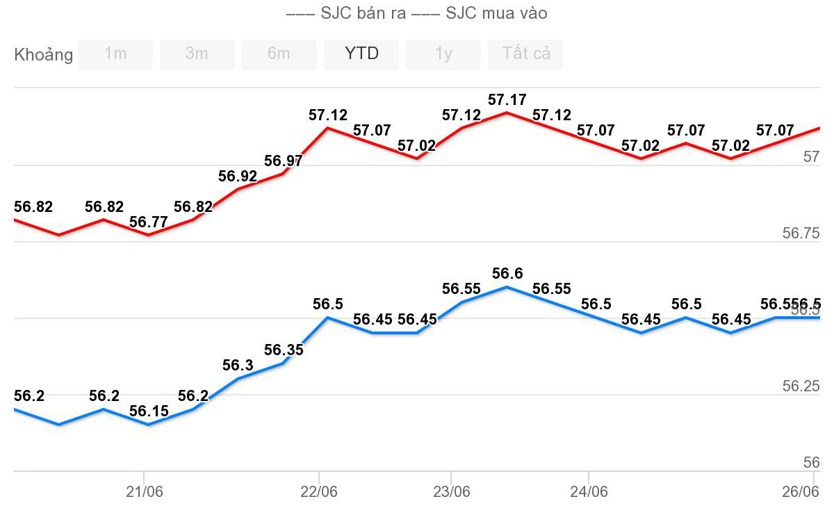 Sau khi rời mức 57 triệu đồng/lượng vào tuần trước, giá vàng tuần này đã bắt đầu tăng trở lại. Theo biểu đồ giá vàng ở chiều bán ra, giá vàng đi từ mức 56.82 triệu đồng/lượng (phiên đầu tuần) sau đó giá vàng giảm xuống mức thấp nhất 56,77 triệu đồng/lượng (ngày 19/6). Các phiên tiếp theo giá vàng có chiều hướng đi lên. Chiều bán ra có mức cao nhất tuần là 57,17 triệu đồng/lượng (23/6) và chốt phiên cuối tuần ở mức 57,12 triệu đồng/lượng.