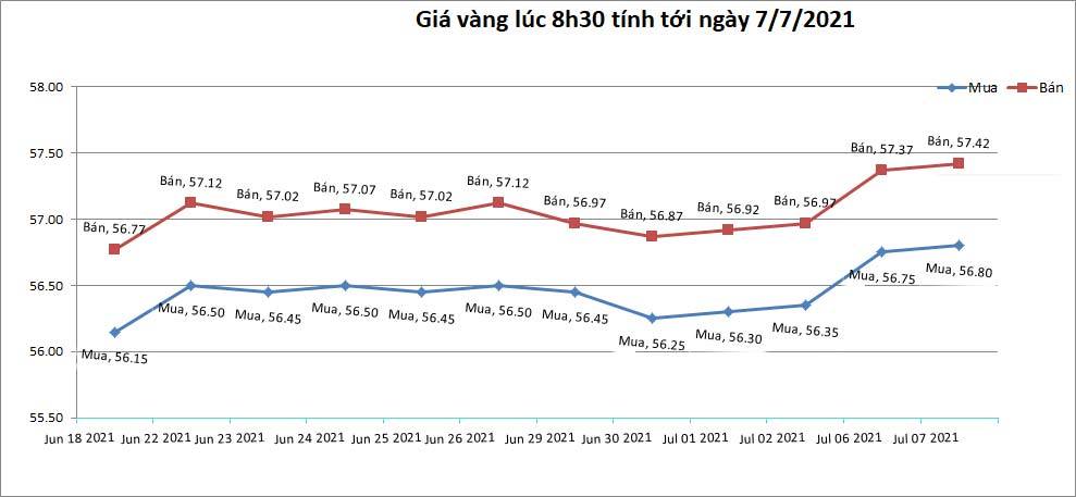 Kết thúc phiên giao dịch 6/7, Tập đoàn Vàng bạc đá quý DOJI niêm yết giá vàng SJC khu vực Hà Nội ở mức: 56,78 triệu đồng/lượng (mua vào) và 57,37 triệu đồng/lượng (bán ra). Công ty Vàng bạc Đá quý Sài Gòn niêm yết vàng SJC ở mức: 56,80 triệu đồng/lượng (mua vào) và 57,42 triệu đồng/lượng (bán ra).