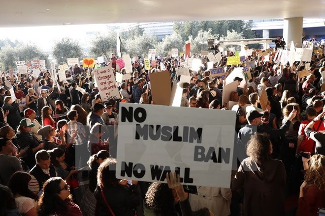 Người dân Mỹ biểu tình phản đối sắc lệnh cấm người tị nạn nhập cảnh của tân Tổng thống Mỹ tại sân bay quốc tế San Francisco ở bang California ngày 28/1. (Nguồn: AFP/TTXVN)