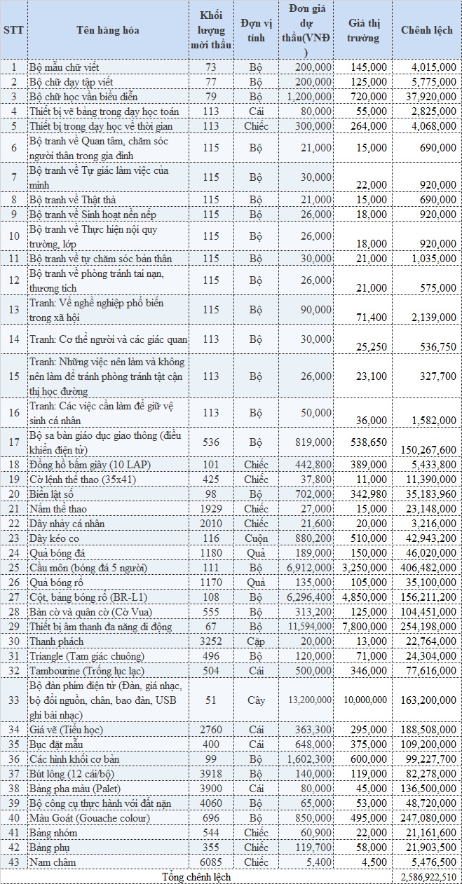 Cụ thể: Ngày 02/11/2022, Giám đốc Sở GD&ĐT Hà Nam Phạm Anh Tuấn ký ban hành Quyết định số 845/QĐ- SGDĐT phê duyệt kết quả lựa chọn nhà thầu Gói thầu số 03: Mua sắm thiết bị dạy học tối thiểu lớp 1 cho các trường tiểu học công lập trên địa bàn tỉnh Hà Nam năm 2022 cho Liên danh Hải Long – Xuất bản giáo dục, đại diện Công ty TNHH thương mại sản xuất và dịch vụ Hải Long, giá trúng thầu là 10.233.993.000 đồng, Đối chiếu, so sánh 43/55 mặt hàng trong gói thầu số 3 này có nhiều mặt hàng giá cao bất thường so với thị trường, chênh lệch lớn về giá trị lên gần 2,6 tỷ đồng.