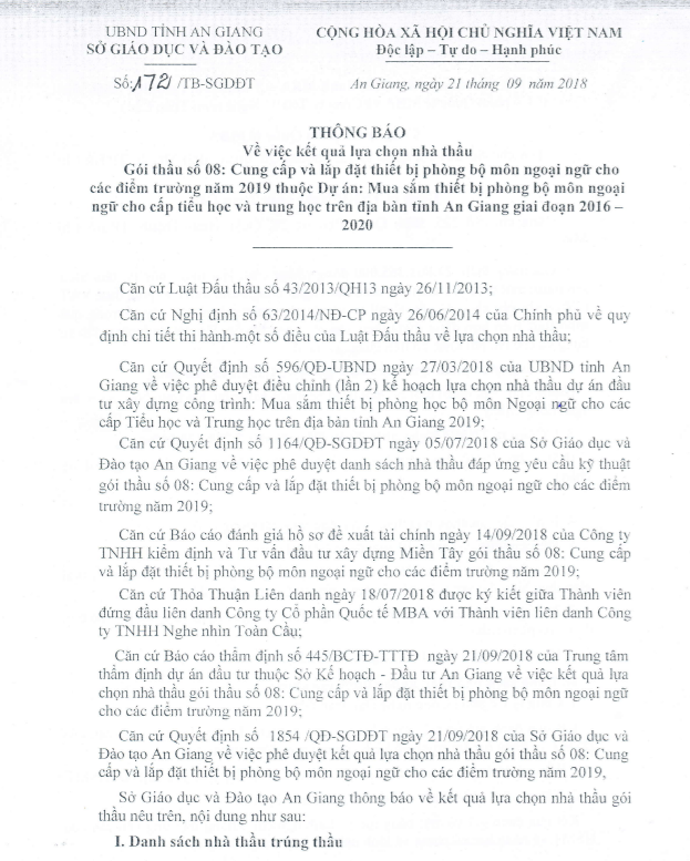 Theo quyết định số 1398/QĐ-SGDĐT ngày 21/09/2018 của Sở GD&ĐT An Giang phê duyệt gói thầu số 08: Cung cấp và lắp đặt thiết bị phòng bộ môn Ngoại ngữ cho các điểm trường năm 2019, liên danh Công ty MBA được phê duyệt trúng thầu với giá 24.861.365.000 đồng (giá gói thầu 25.015.000.000 đồng). Trong đó riêng Công ty MBA trúng phần lớn với trị giá 21.132.245.000 đồng.