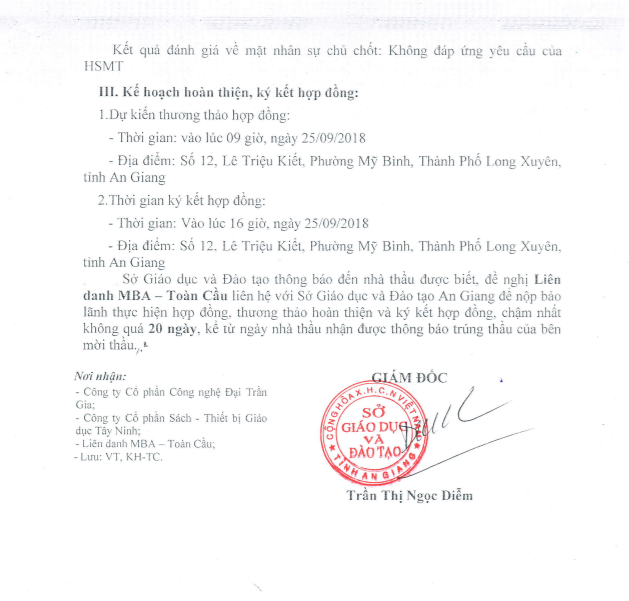 Tương tự, tháng 8/2021 bà Trần Thị Ngọc Diễm – Giám đốc Sở GD&ĐT An Giang ký quyết định số 1457/QĐ-SGDĐT ngày 26/08/2021 phê duyệt Công ty MBA trúng gói thầu số 02: Cung cấp và lắp đặt thiết bị với giá 407.120.000 đồng (giá gói thầu 410.100.000 đồng).