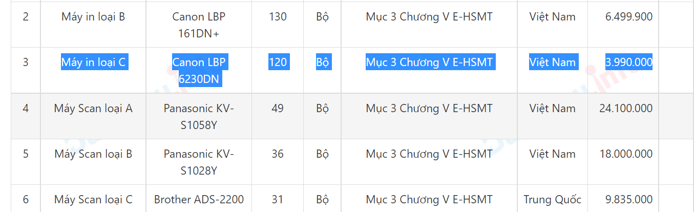 Một so sánh khác, cùng thiết bị Máy in laser Canon, LBP 6230DN nhưng Sở Thông tin và Truyền thông tỉnh Bình Dương duyệt mua với giá thấp hơn gần 3 triệu đồng/cái so với giá duyệt mua của Sở GD&ĐT An Giang, chỉ 3.990.000 đồng/cái.