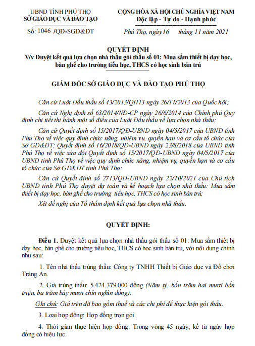 Theo phản ánh, tháng 11/2021 tại gói thầu số 01: Mua sắm thiết bị dạy học, bàn ghế cho trường tiểu học, THCS có học sinh bán trú, Công ty TNHH thiết bị giáo dục và đồ chơi Tràng An được phê duyệt trúng thầu với giá 5.424.379.000 đồng (giá gói thầu 5.592.412.000 đồng) theo quyết định số 1046/QĐ-SGD&ĐT ngày 16/11/2021 do ông Nguyễn Văn Mạnh, giám đốc Sở GD&ĐT tỉnh Phú Thọ ký.