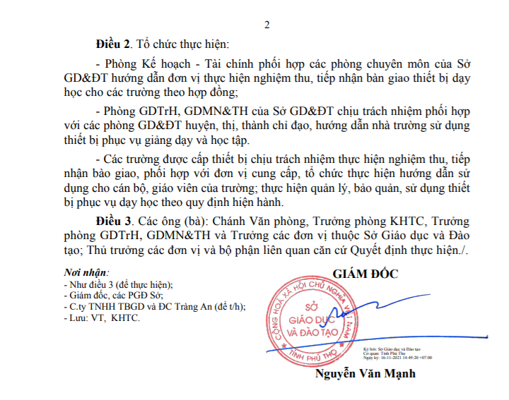 Quyết định phê duyệt trúng thầu do ông Nguyễn Văn Mạnh, giám đốc Sở GD&ĐT tỉnh Phú Thọ ký.