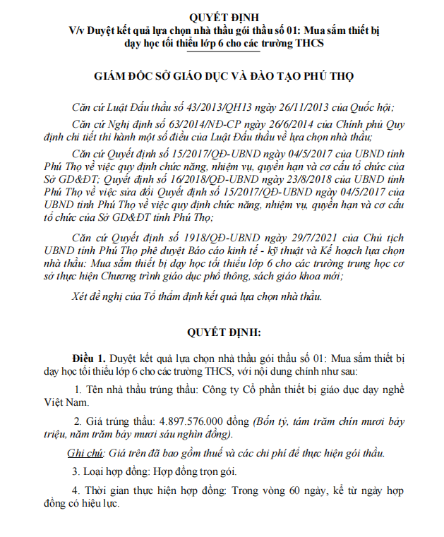 Trước đó, tháng 8/2021, Công ty cổ phần thiết bị giáo dục dạy nghề Việt Nam được Sở GD&ĐT tỉnh Phú Thọ phê duyệt trúng gói thầu số 01: Mua sắm thiết bị dạy học tối thiểu lớp 6 cho các trường trung học cơ sở với giá 4.897.576.000 đồng theo quyết định số 850/QĐ-SGD&ĐT ngày 15/9/2021 do ông Nguyễn Văn Mạnh, giám đốc Sở GD&ĐT tỉnh Phú Thọ ký. Giá gói thầu là 4.990.350.000 đồng.