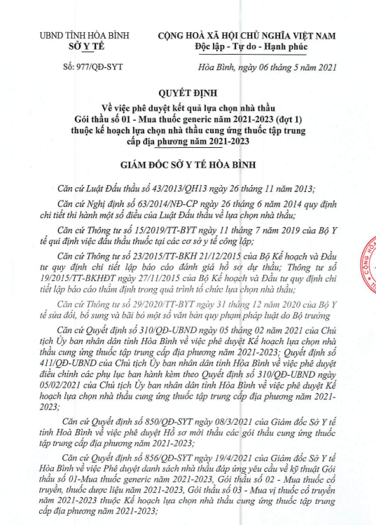 Theo phản ánh, tháng 3/2021 tại gói thầu số 01: Mua thuốc generic đợt 1 năm 2021-2023 thuộc Dự toán mua sắm Cung ứng thuốc tập trung cấp địa phương năm 2021-2023 có giá dự toán là 957.791.245.015 đồng (chín trăm năm mươi bảy tỉ, bảy trăm chín mươi mốt triệu, hai trăm bốn mươi năm nghìn, mười năm đồng) do Sở Y tế Hòa Bình phê duyệt theo quyết định số 977/QĐ-SYT ngày 06/5/2021 do bà Bùi Thu Hằng, giám đốc Sở Y tế Hòa Bình ký.