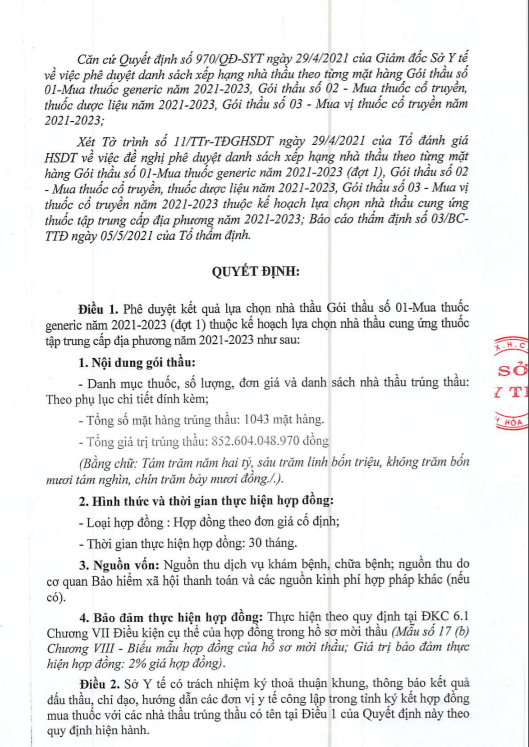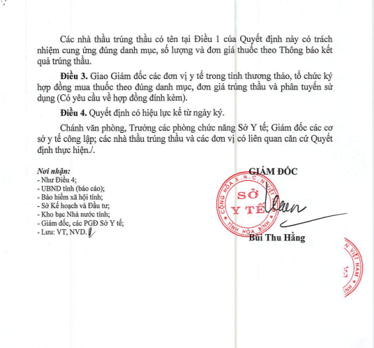 Quyết định phê duyệt trúng thầu do bà Bùi Thu Hằng, giám đốc Sở Y tế Hòa Bình ký.