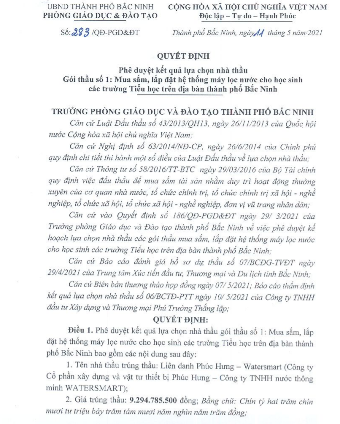 Tương tự, trước đó tháng 5/2021 tại gói thầu số 1: Mua sắm, lắp đặt hệ thống máy lọc nước cho học sinh các trường Tiểu học trên địa bàn thành phố Bắc Ninh, liên danh Công ty CP xây dựng và vật tư thiết bị Phúc Hưng - Công ty TNHH nước thông minh WATERSMART cũng được phê duyệt trúng thầu với giá 9.412.000.000 đồng (giá trúng thầu 9.294.785.500 đồng) theo quyết định số 283/QĐ-PGD&ĐT ngày 11/5/2021 do ông Nguyễn Cương Nghị - Trưởng Phòng GD&ĐT TP Bắc Ninh ký.