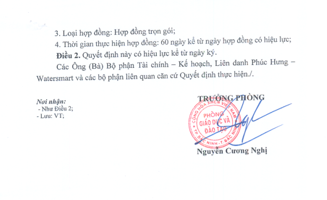 Quyết định phê duyệt trúng thầu do ông Nguyễn Cương Nghị, Trưởng phòng GD&ĐT TP Bắc Ninh ký.