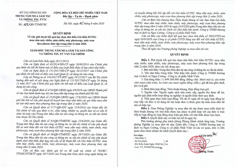 Như vậy sau đấu thầu, thầu 02 TS2: Mua sắm máy chiếu, màn chiếu, máy photocopy, máy scan theo phương thức tập trung (đợt 2) năm 2020. Giá trúng thầu là 11.699.360.000 đồng (Mười một tỷ sáu trăm chín mươi chín triệu ba trăm sáu mươi nghìn đồng). Số tiền tiết kiệm cho ngân sách Nhà nước là 127.370.000 đồng, đạt tỉ lệ 1%.