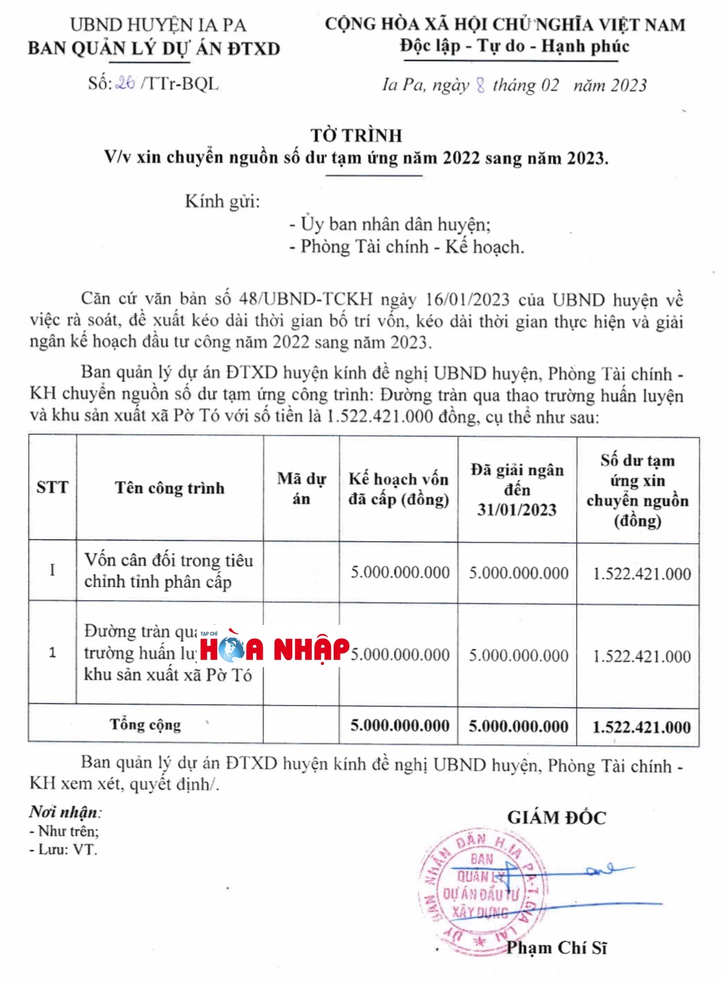 Trong khi dự án vẫn còn rất nhiều hạng mục dở dang, bề bộn, khối lượng thi công mới đạt khoảng trên 30% nhưng ông Phạm Chí Sĩ - Giám đốc Ban Quản lý dự án đầu tư xây dựng huyện Ia Pa đã lập hồ sơ ký khống nghiệm thu thanh toán khối lượng để giải ngân với số tiền 5 tỷ đồng, tương đương 75% giá trị xây lắp. Số tiền tạm ứng còn lại là 1,522 tỷ đồng cũng được ông Sĩ đề nghị UBND huyện Ia Pa quyết định chuyển nguồn vốn sang năm 2023 nhằm hợp thức hóa vốn đầu tư công.