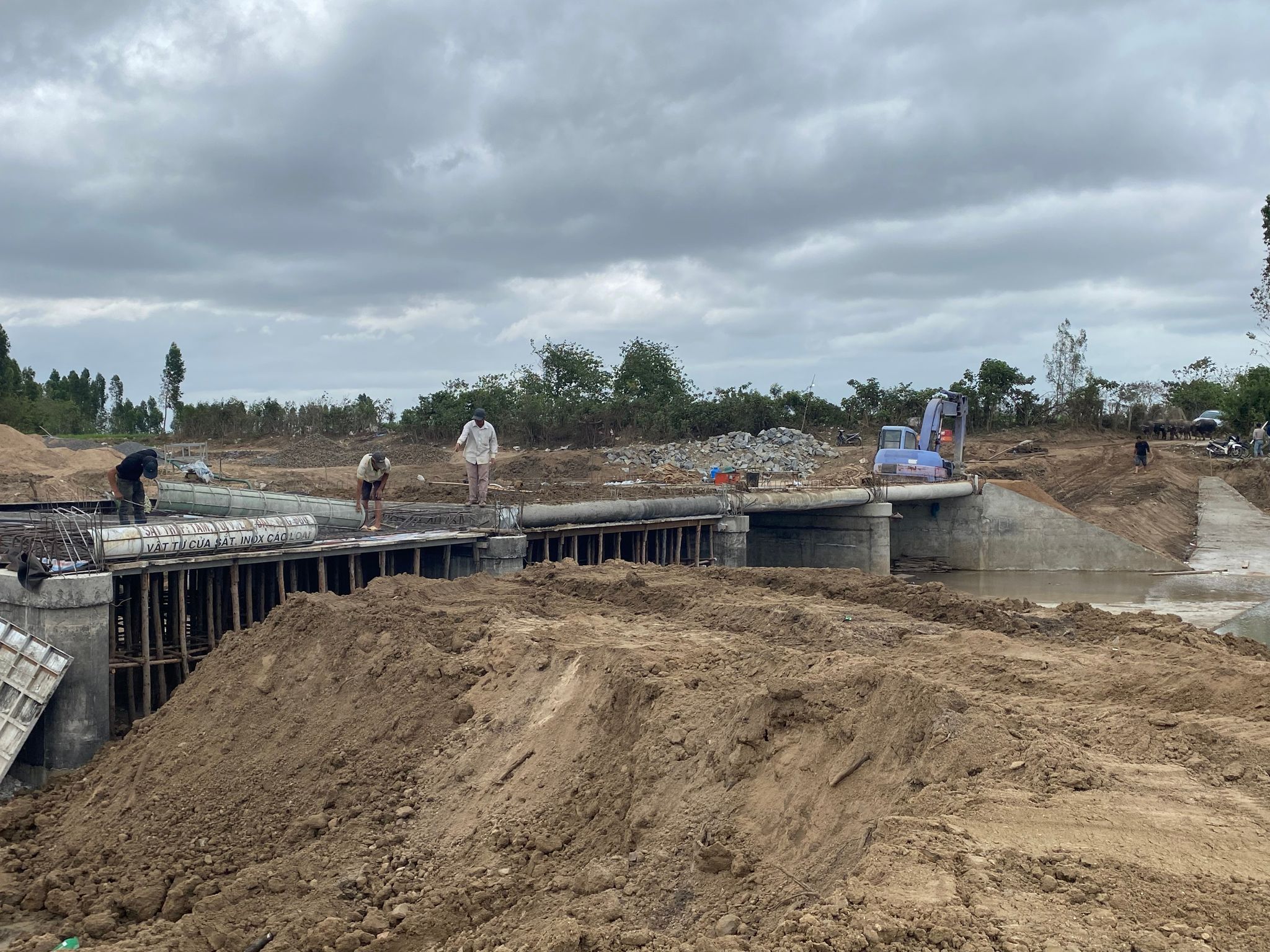 Theo hợp đồng, thời gian hoàn thành dự án là 240 ngày, nhưng đến nay đã quá hạn, công trình còn ngổn ngang, bề bộn với chỉ 5 đến 6 công nhân,, nhà thầu thi công mới được một phần nhỏ đập tràn, còn lại các hạng mục khác hầu hết chưa triển khai.