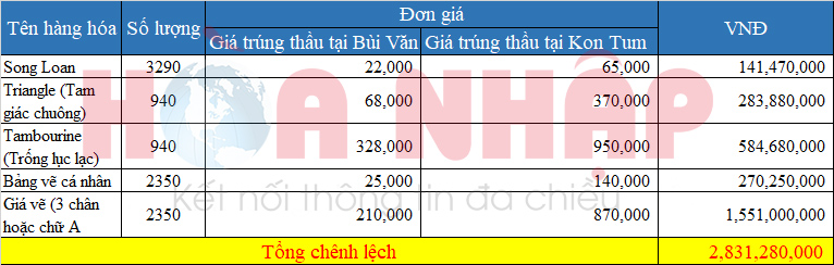 So sánh với gói thầu Mua sắm trang thiết bị dạy học tối thiểu lớp 1 của trường Tiểu học Bùi Văn Ngữ (Thành phố Hồ Chí Minh), chỉ tính riêng 5 hạng mục giá trị tương đối nhỏ (song loan, Triangle, tambourine, bảng vẽ cá nhân, giá vẽ), khi lập bảng so sánh với giá trúng thầu số tiền chênh lệch hơn 2,8 tỷ đồng. Những chủng loại hàng hóa này giá chênh lệch lên tới 300%. Việc so sánh giá với chủng loại hàng hoá giống hệt nhau về quy cách, tiêu chuẩn, thông số kỹ thuật.