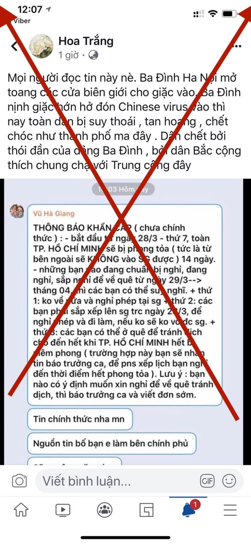 Trước thông tin trên, trưa 26/3, UBND TP.HCM ra thông báo khẳng định thông tin trên hoàn toàn là bịa đặt. TP.HCM yêu cầu người dân không được chia sẻ các thông tin không kiểm chứng, sai sự thật, cần theo dõi, cập nhật tình hình dịch bệnh trên các kênh thông tin chính thống.