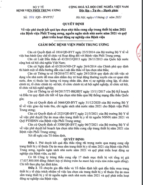 Tháng 9/2021 lãnh đạo BV Phổi Trung ương đã ký quyết định phê duyệt lựa chọn nhà thầu Công ty TNHH thiết bị và công nghệ y tế Việt Nam và liên danh (Công ty TNHH thiết bị y tế Nhật Nam) là đơn trúng gói thầu: TB 02-2021 Trang thiết bị chẩn đoán hình ảnh, điều trị”. Giá trúng thầu là 2.741.500.000 đồng (giá gói thầu 2.750.000.000 đồng) theo quyết định số 998/QĐ-BVPTƯ ngày 08/09/2021 do ông Nguyễn Viết Nhung – Giám đốc Bệnh viện Phổi Trung ương ký. Gói thầu này có chỉ số tiết kiệm ngân sách không đáng kể.