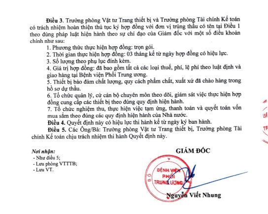 Quyết định phê duyệt lựa chọn nhà thầu Công ty TNHH thiết bị và công nghệ Việt Nam do ông Nguyễn Viết Nhung, giám đốc BV Phổi Trung ương ký.