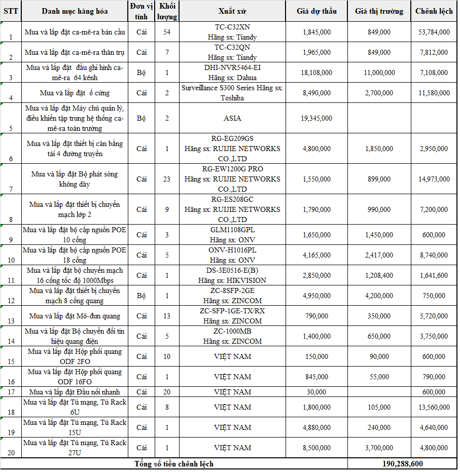 Trong gói thầu Sửa chữa, bảo trì, lắp đặt camera và đường mạng internet tại trường THPT Phan Huy Chú - Đống Đa có mã thông báo mời thầu IB2300182568 có giá gói thầu là 410.316.000 VND, công ty cổ phần Phạm Gia Nam Long đã trúng thầu với giá 370.293.000 VND, tuy nhiên giá các loại hàng hóa lại cao bất thường so với giá thị trường. Cụ thể như loại hàng hóa ca-mê-ra bán cầu nhà thầu cấp mã TC-C32XN Hãng sx: Tiandy giá thị trường trung bình chỉ 849.000 VNĐ, thậm chí tại trang hacom.vn bán lẻ chỉ 559.999 VNĐ thì đơn vị trúng thầu với giá 1.845.000 VNĐ. hàng hóa ca-mê-ra bán trụ nhà thầu cấp mã TC-C32QN Hãng sx: Tiandy giá thị trường trung bình chỉ 849.000 VNĐ, thậm chí tại trang hacom.vn bán lẻ chỉ 559.999 VNĐ thì đơn vị trúng thầu với giá 1.965.000 VNĐ.