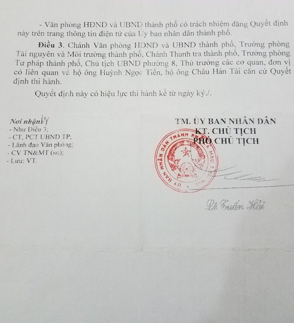Thực tế cho thấy, chính Quyết định số 1197/QĐ-UBND ngày 21/8/2000 của UBND TP.Cà Mau có nội dung không đúng bản chất vụ việc, dẫn tới kéo dài 20 năm và thiệt hại về nhiều mặt cho gia đình ông Châu Hán Tài. Dư luận người dân địa phương đề nghị UBND tỉnh Cà Mau, kiểm tra, rà soát lại việc thực hiện Quyết định của UBND tỉnh về việc thu hồi, hủy bỏ Quyết định số 332/QĐ-CT.UB ngày 4/4/2001 và Quyết định số 620/QĐ-CT.UB ngày 11/6/2001 của Chủ tịch UBND tỉnh Cà Mau, về việc giải quyết tranh chấp giữa hộ ông Huỳnh Ngọc Tiễn với hộ ông Châu Hán Tài, bảo vệ quyền và lợi ích hợp pháp của công dân, đã bị thiệt hại trong 20 năm qua. Trách nhiệm này thuộc về ai!?