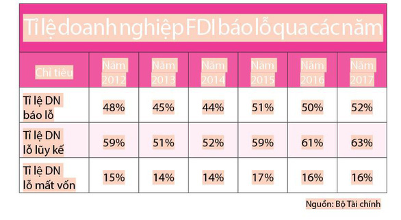 Tuy nhiên, theo lãnh đạo Bộ Tài chính, hiệu quả hoạt động của doanh nghiệp FDI có vấn đề khi doanh thu và lợi nhuận trước thuế tăng đều nhưng tỉ lệ doanh nghiệp báo lỗ, lũy kế và lỗ mất vốn cứ tăng cao. Lợi nhuận trước thuế của khối doanh nghiệp này trong năm 2017 đạt trên 344.600 tỉ đồng, tăng 19,2% so với năm 2016.