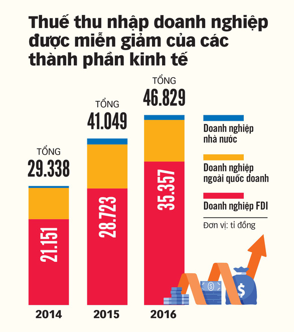 Tỉ lệ về số thuế thu nhập doanh nghiệp được ưu đãi, miễn giảm của doanh nghiệp FDI là 48% trên tổng số thuế thu nhập doanh nghiệp phải nộp tính theo thuế suất phổ thông, trong khi tỉ lệ này của doanh nghiệp nhà nước là 4,6%, doanh nghiệp ngoài quốc doanh là 14%.