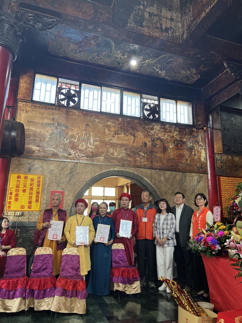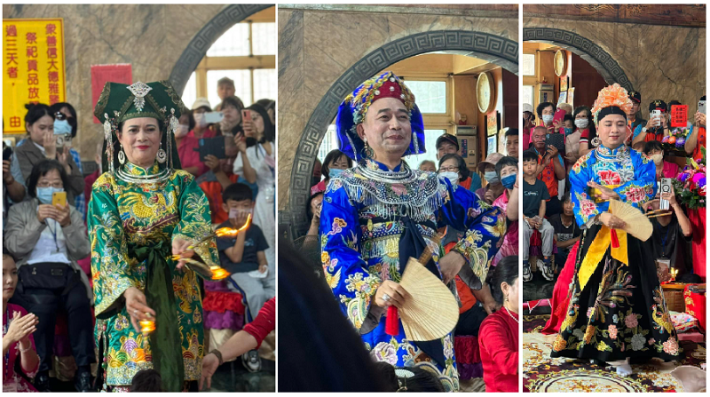 NNƯT Trần Thị Huệ – Thủ nhang Phủ Chính Phủ Dầy cùng NNƯT Vũ Thanh Bình và NNDG Lưu Hải Trường thực hành nghi thức hầu đồng tại Nhân Thọ Cung (Cao Hùng, Đài Loan)