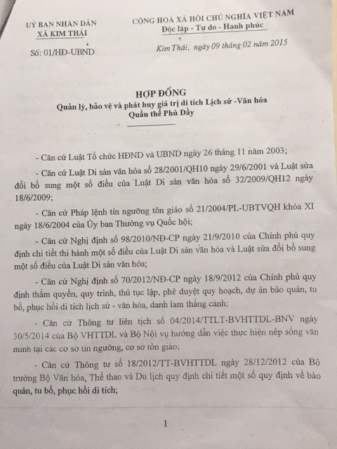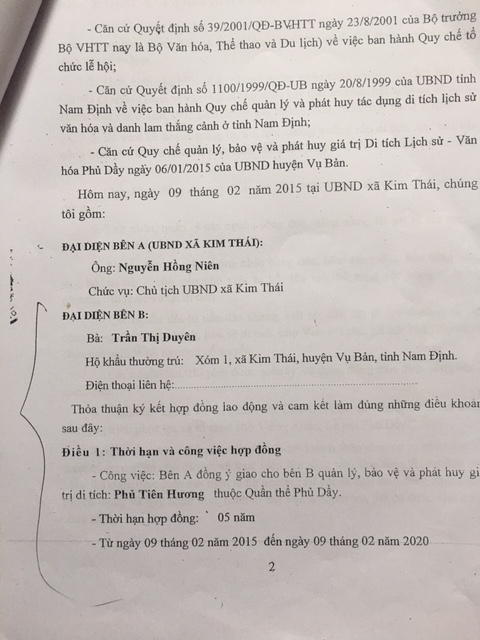 Hợp đồng số 01/HĐ-UBND ngày 09/02/2015 thể hiện rõ đại diện bên A là ông Nguyễn Hồng Niên, Chủ tịch UBND xã Kim Thái; đại diện bên B là bà Trần Thị Duyên, giao cho bà Duyên quản lý, bảo vệ và phát huy giá trị di tích phủ Tiên Hương với thời hạn 05 năm