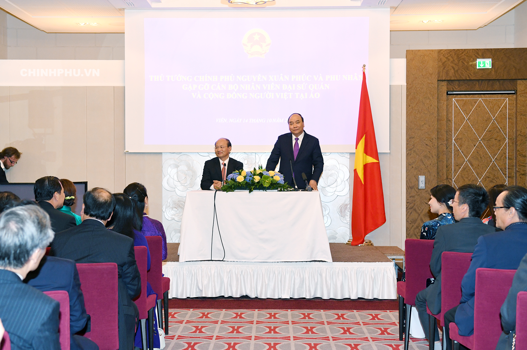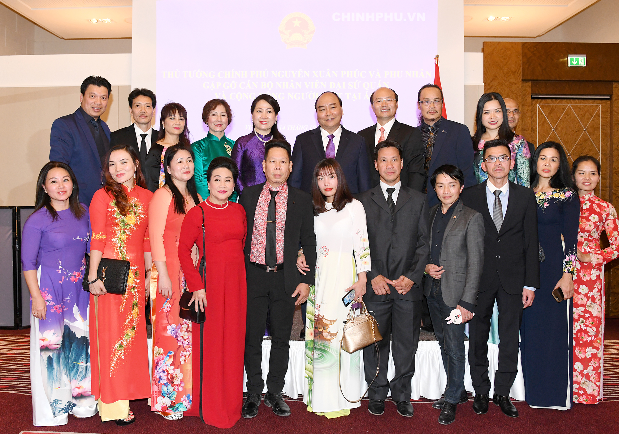 | Thủ tướng Nguyễn Xuân Phúc và Phu nhân gặp gỡ, nói chuyện với cán bộ, nhân viên Đại sứ quán, cộng đồng người Việt tại Áo và một số nước châu Âu. Ảnh VGP/Quang Hiếu |