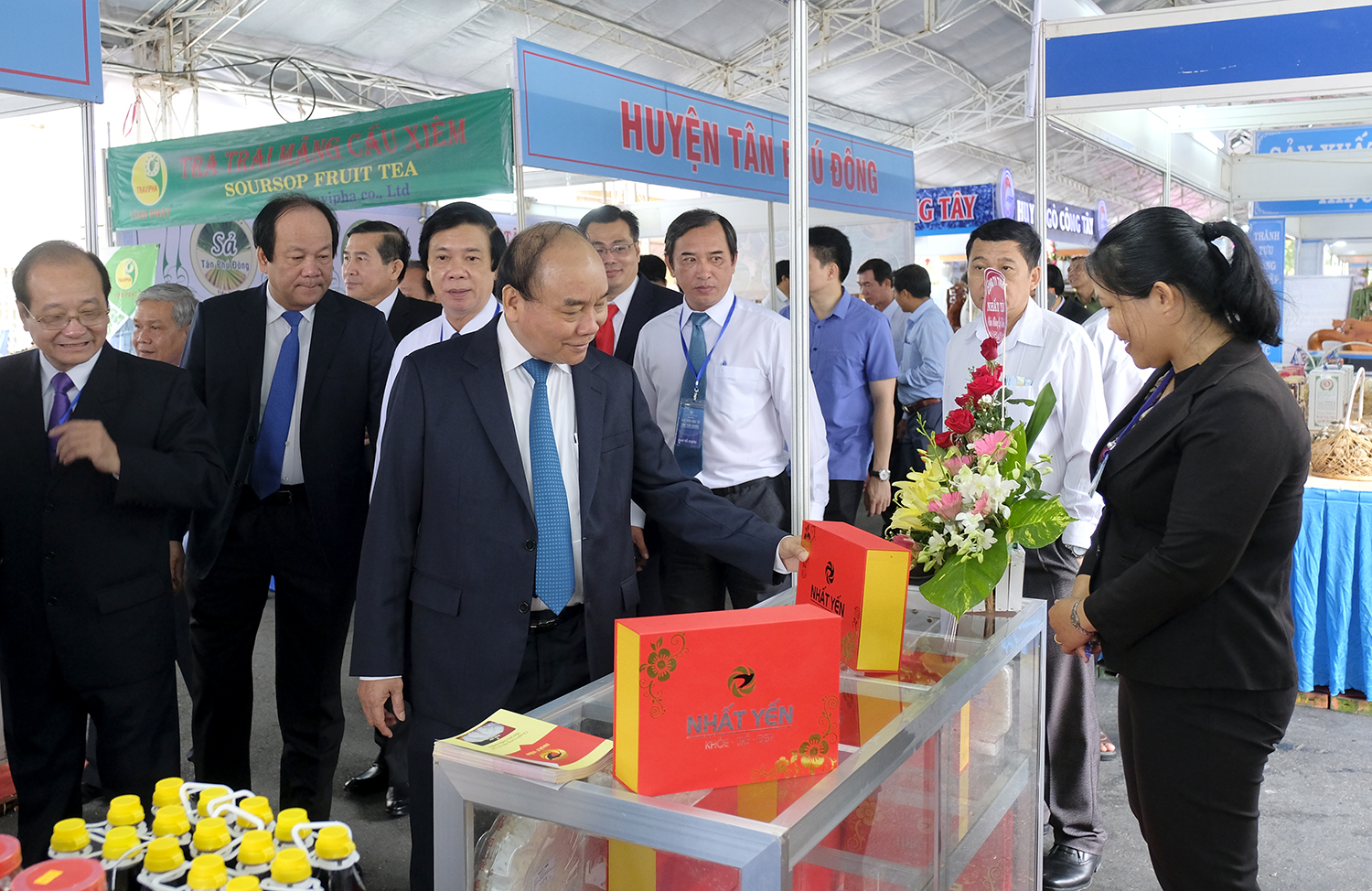 | Thủ tướng thăm các gian hàng trưng bày sản phẩm của doanh nghiệp đầu tư tại Tiền Giang. Ảnh: VGP/Quang Hiếu |