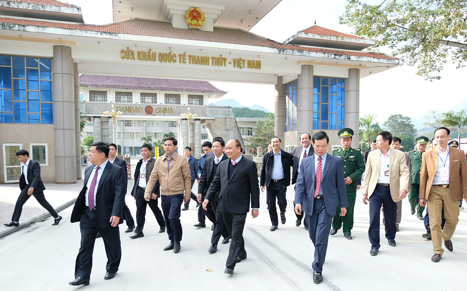 Trước đó, Thủ tướng đã đến thăm Cửa khẩu quốc tế Thanh Thủy, Hà Giang. Sau khi thị sát quy trình làm thủ tục xuất nhập cảnh, trao đổi với cán bộ, nhân viên cửa khẩu, Thủ tướng đánh giá cao việc đổi mới, đơn giản hóa thủ tục, rút ngắn thời gian làm thủ tục cho doanh nghiệp. Hiện nay, thời gian thông quan đối với mỗi xe container còn khoảng 3 phút. Thủ tướng đề nghị tiếp tục tạo điều kiện thuận lợi cho người dân và doanh nghiệp khi kinh tế biên mậu là một trong những lĩnh vực chủ chốt của Hà Giang.