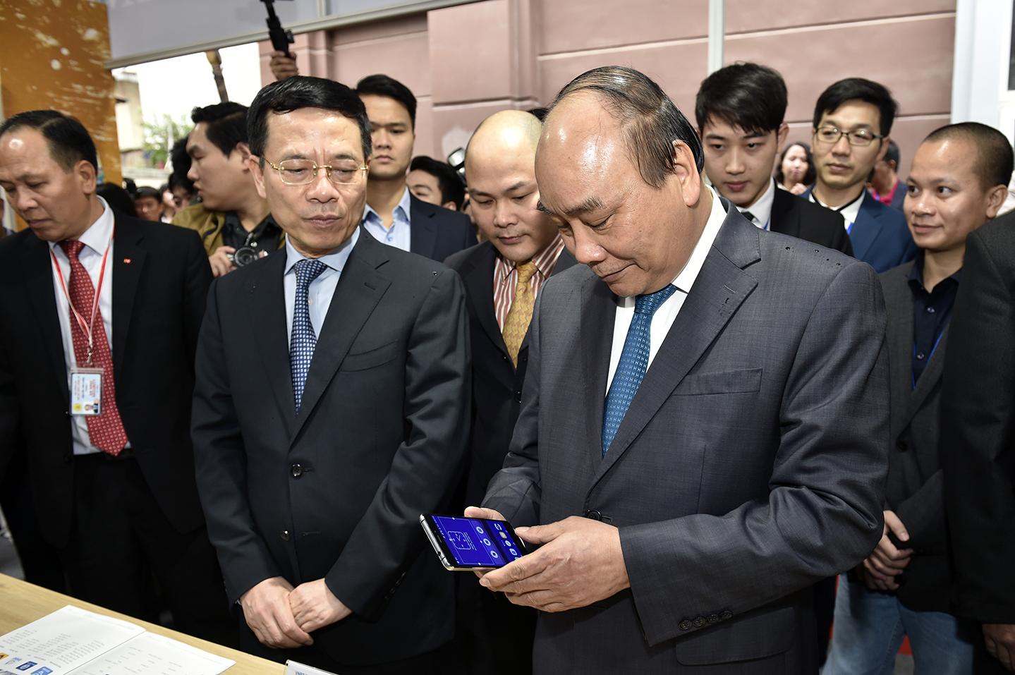 | Thủ tướng thăm gian triển lãm điện thoại thông minh của Vingroup. Ảnh: VGP/Nhật Bắc |