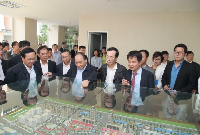 | Thủ tướng Nguyễn Xuân Phúc xem mô hình nhà ở xã hội khu Đặng Xá, Gia Lâm, Hà Nội. ảnh:VGP