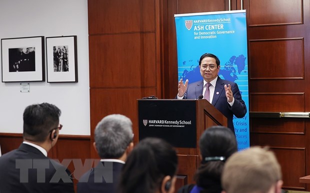 Thủ tướng Phạm Minh Chính phát biểu tại Đại học Harvard. (Ảnh: Dương Giang/TTXVN)