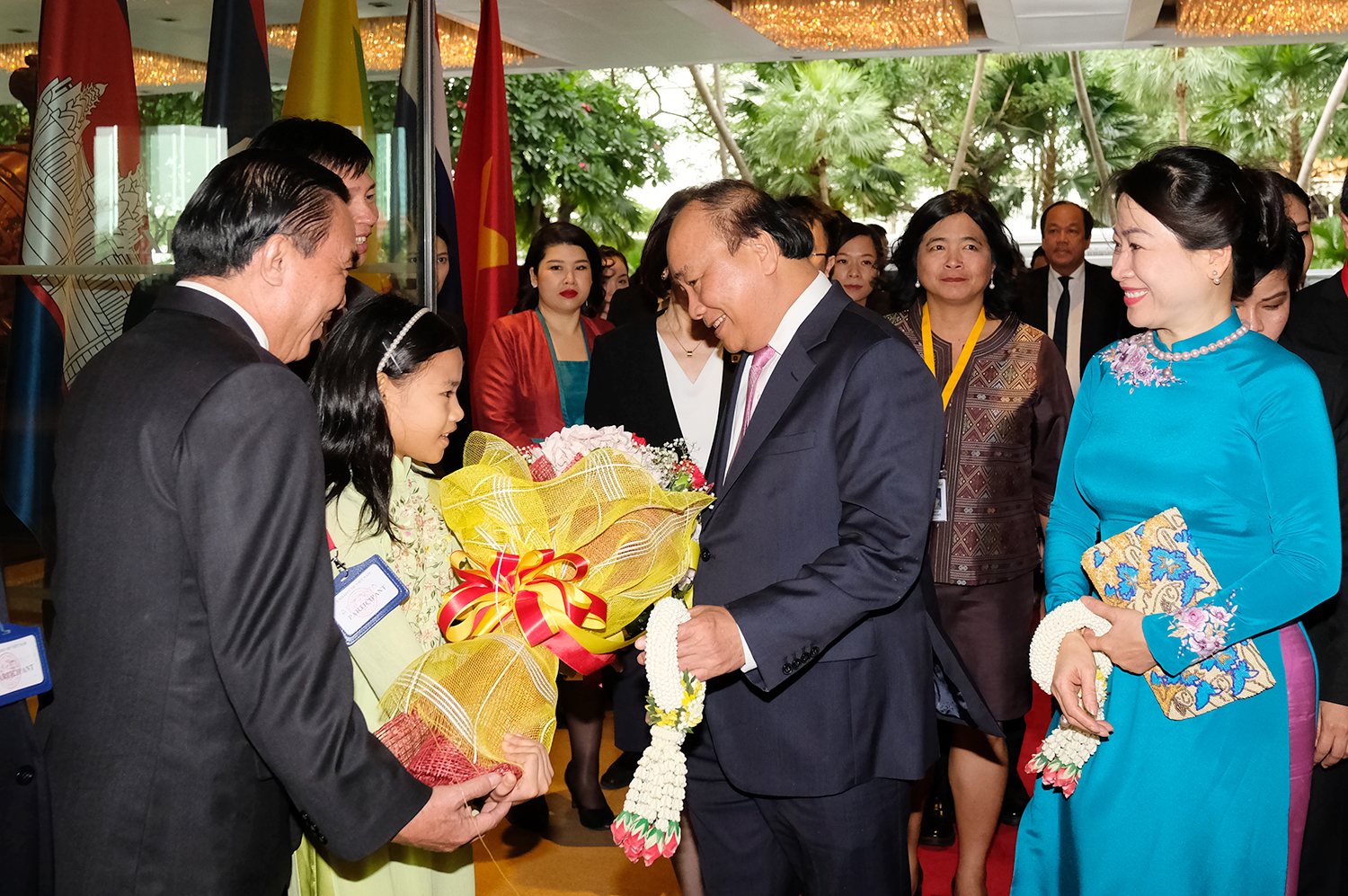 Đón Thủ tướng và Phu nhân tại sân bay có Bộ trưởng Bộ Xã hội và Kinh tế số Thái Lan Pichet Durongkaveroj, đại diện lãnh đạo Bộ Ngoại giao Thái Lan và về phía Việt Nam có Đại sứ Việt Nam tại Vương quốc Thái Lan Nguyễn Hải Bằng, Phu nhân và cán bộ, nhân viên Đại sứ quán.